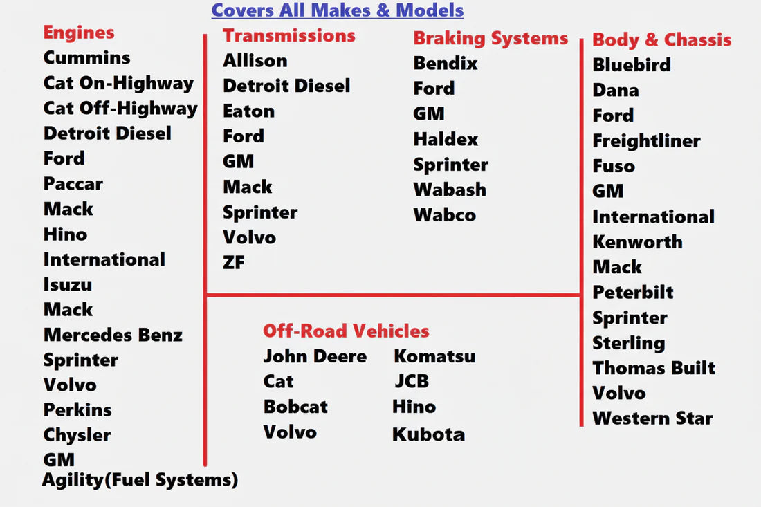 Cummins • Detroit Diesel • Caterpillar (On- & Off-Highway) • PACCAR • Volvo • Mack • International/Navistar • Ford (Medium-Duty) • GM (Medium-Duty) • Hino • Isuzu • Perkins • Mercedes-Benz/Sprinter • Agility Fuel Systems